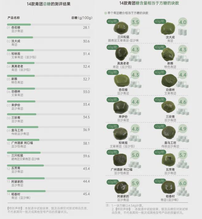 注:该图来自2020 年 4 月,《消费者报道》向权威第三方检测机构送检的14 款预包装青团测评结果